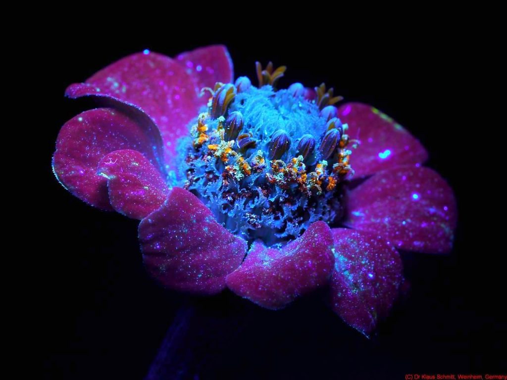 Nosotros no vemos la banda ultravioleta (somos ciegos para los colores de longitud de onda por debajo de los 400 nm), pero percibimos con gran facilidad toda la banda roja; sin embargo, las abejas que son muy sensibles al ultravioleta son ciegas para el rojo (no distinguen colores por encima de los 650 nm). En un ejercicio de visualización mágica, el fotógrafo Craig Burrows retrata flores bajo una técnica de luz ultravioleta inducida por fluorescencia, la cual en cierta manera evoca las visiones de los insectos, o al menos nos permite imaginar cómo sería percibir el mundo bajo esta luz.
